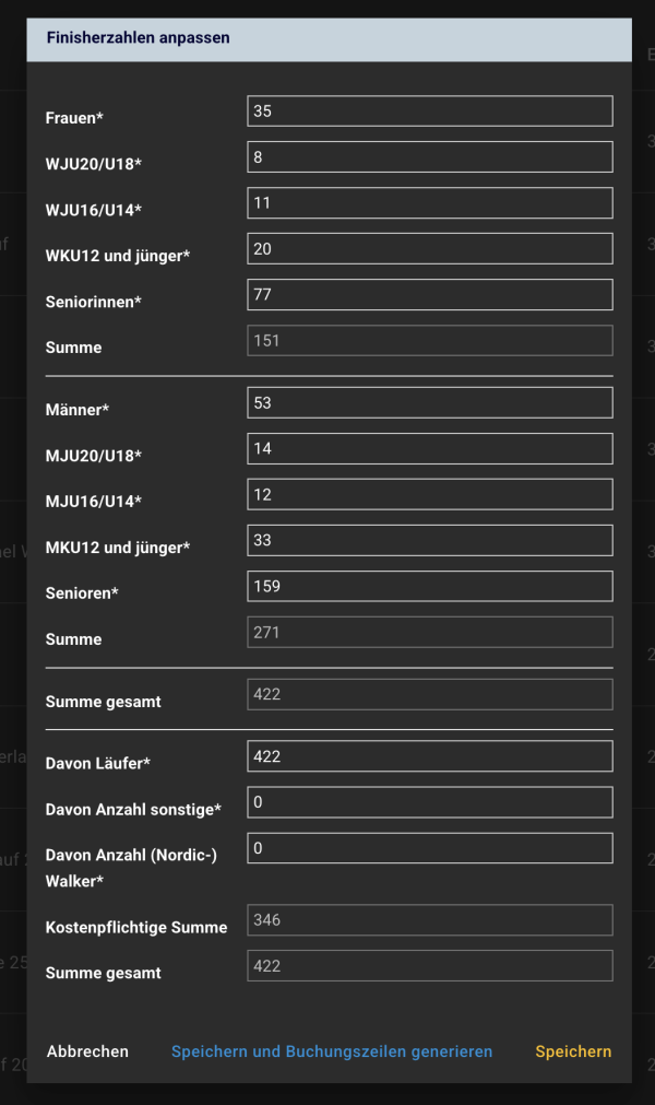 Dort werden die Finisherzahlen in der Form zusammengefasst, wie sie für die Erfassung der Finisherzahlen in LANET3 benötigt werden.