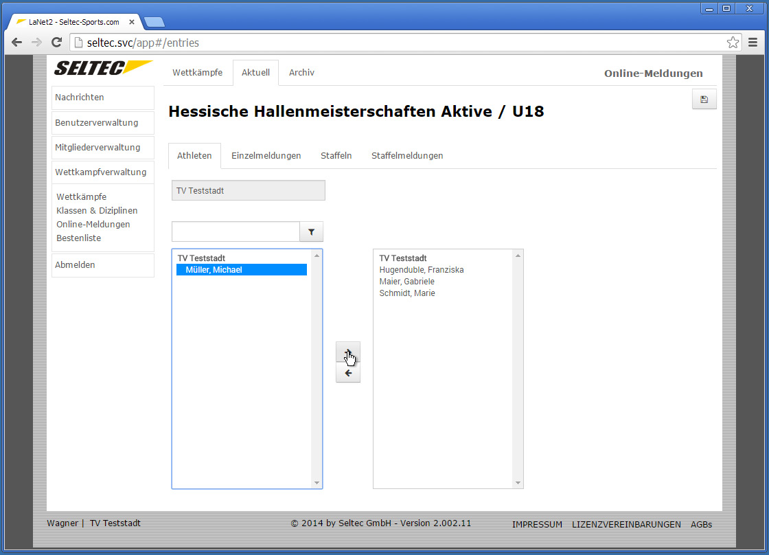To do this, select the tab Relay entries and choose the desired relay on the right. Now you can assign the athletes listed on the left to the relay by double-clicking on them.