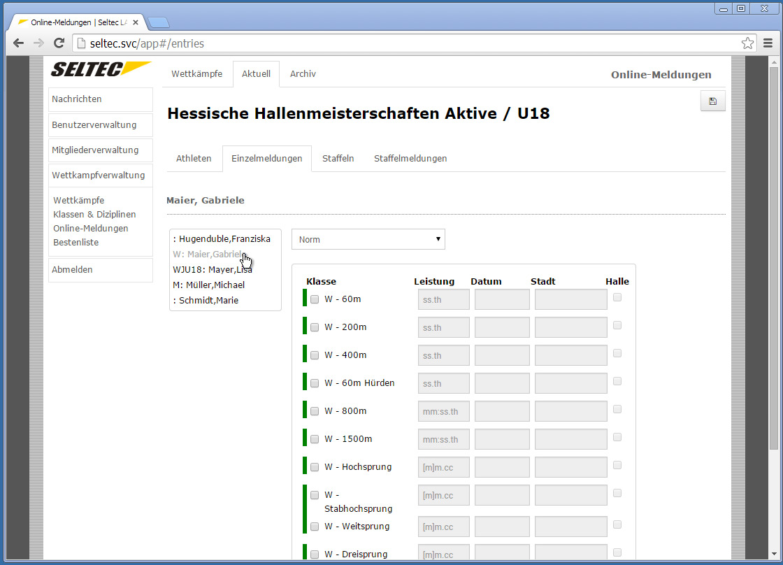 - Norm Standard for the competitions offered in the athlete's age group. This is the „normal“ way of entering an athlete - e.g. an athlete in MJU 18 is to be entered in MJU 18.
