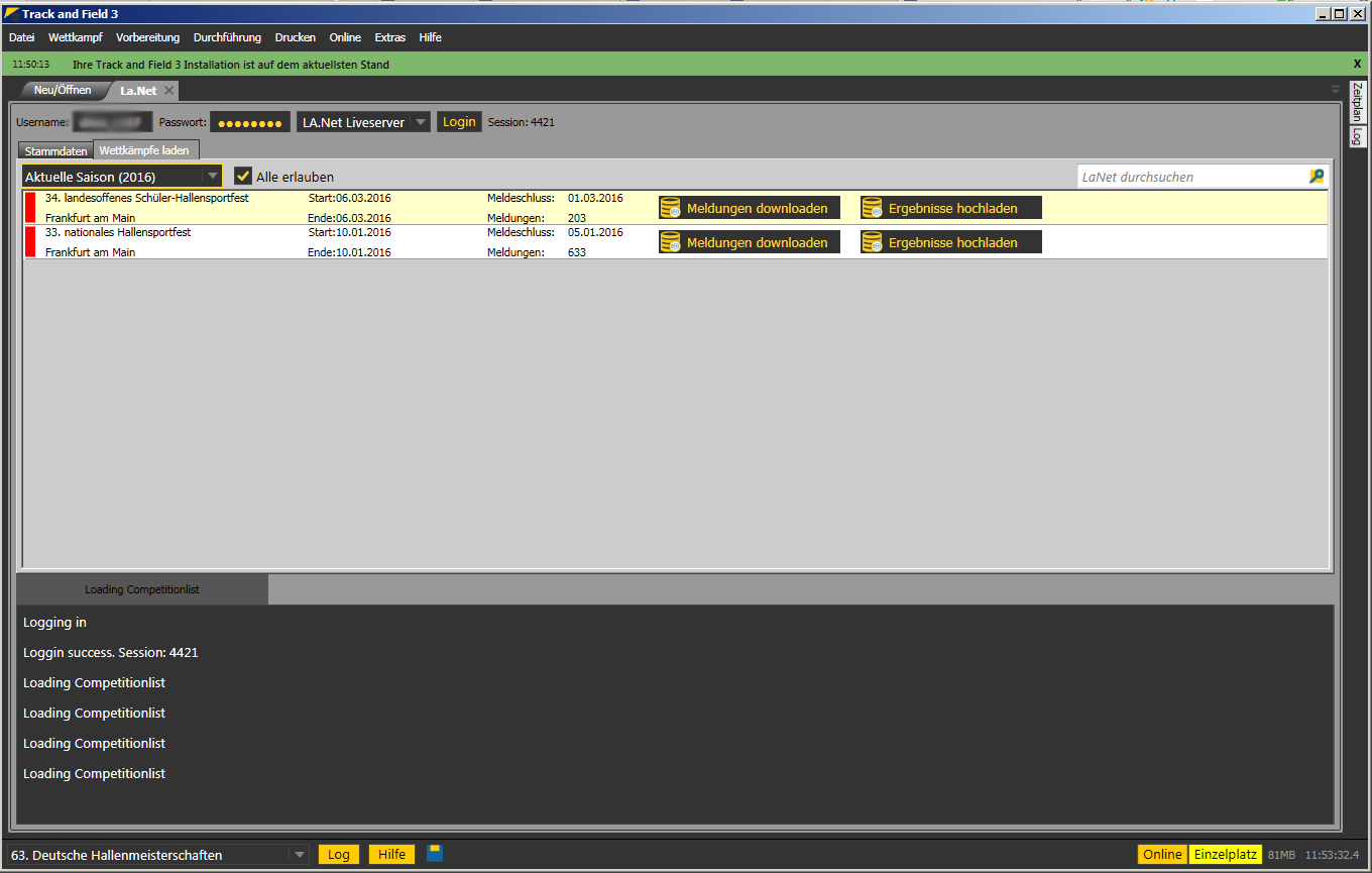 Im Menupunkt Online wählt man dann LA.Net und meldet sich mit seinen Zugangsdaten bei LA.Net an. Im Tab Wettkämpfe laden kann man nun auf die Veranstaltungen zugreifen.